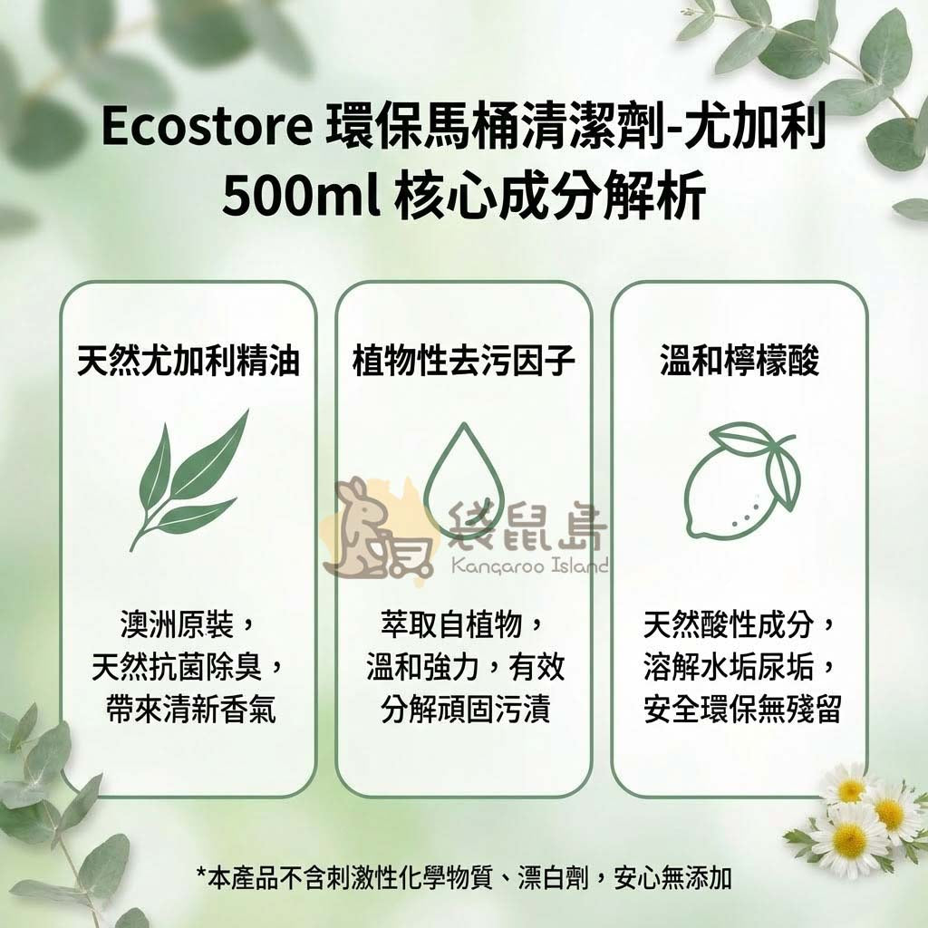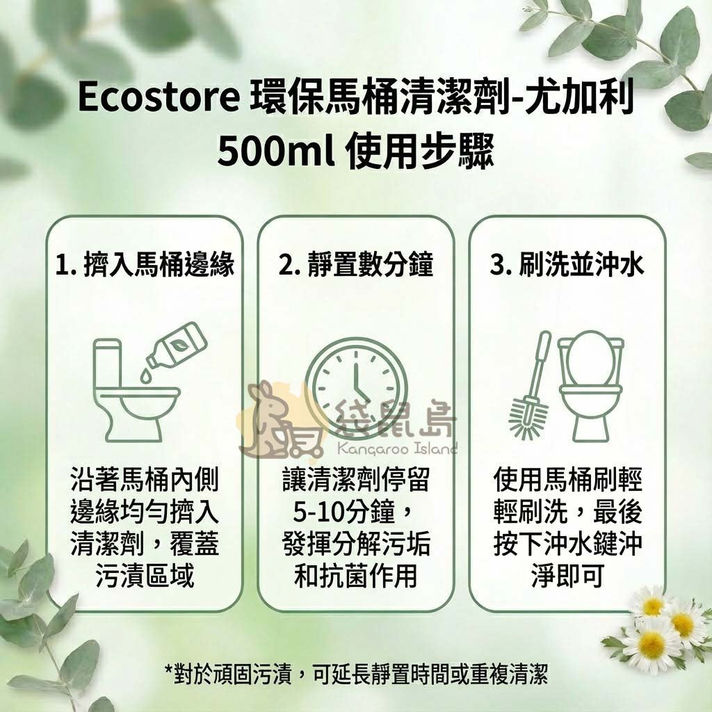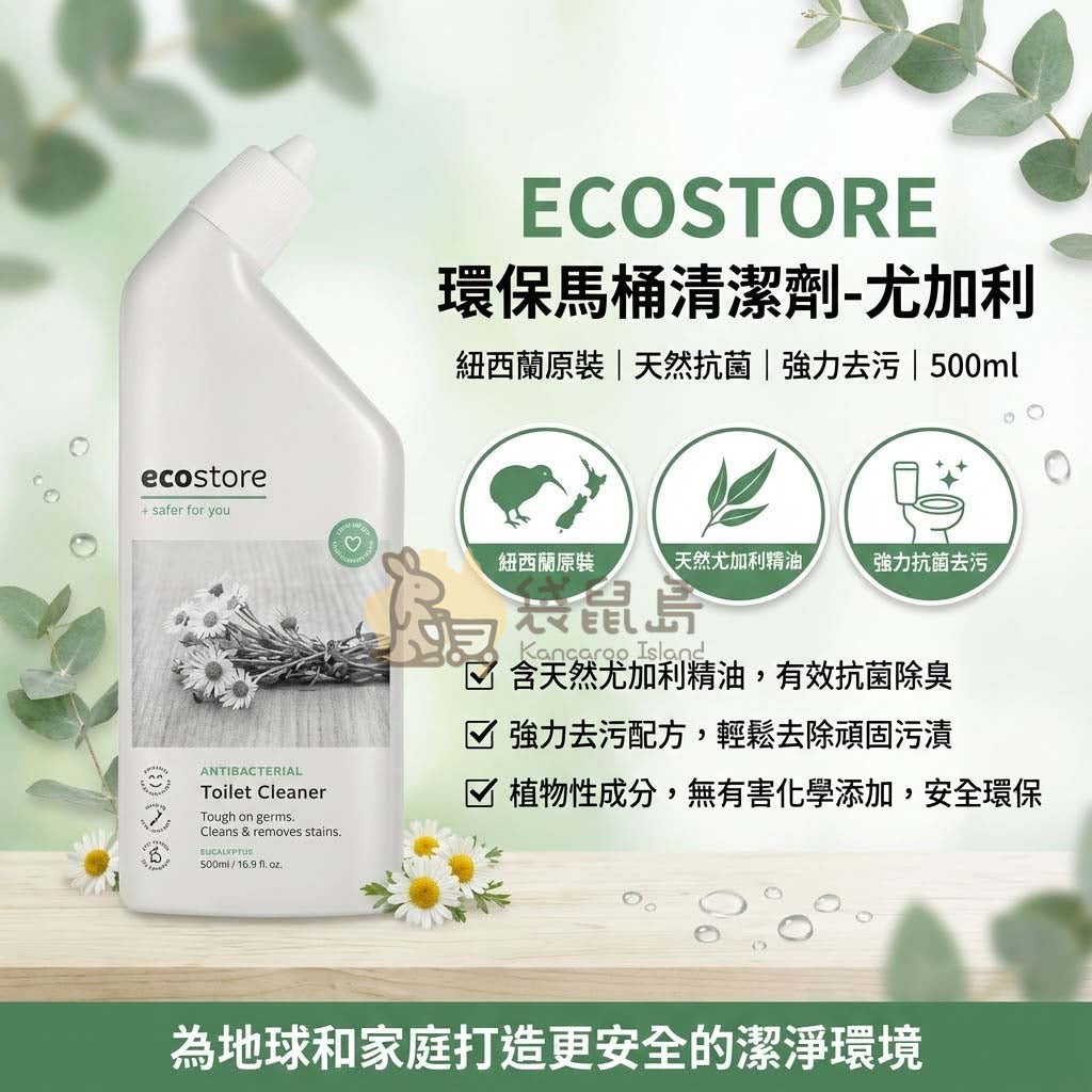 您是否受夠了打掃廁所時,那股令人窒息的漂白水刺鼻味?來自紐西蘭與澳洲備受推崇的綠色品牌 —— Ecostore 尤加利環保馬桶清潔劑,為您的衛浴空間帶來革命性的清新體驗!為您從澳洲原裝空運直寄,確保您收到的是最新鮮、最純淨的居家好幫手。告別化學殘留,用大自然的力量對抗頑固污垢,守護家人的每一次深呼吸。🌿