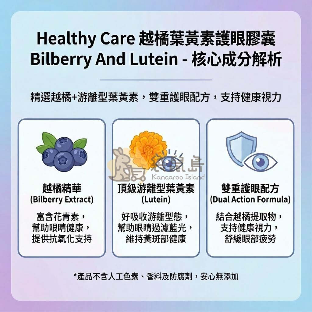 還在尋找能同時兼顧「舒適感」與「黃斑部健康」的營養補給嗎?🇦🇺 Healthy Care 越橘葉黃素護眼膠囊 結合了兩大護眼明星成分:富含花青素的越橘萃取物與優質葉黃素。這款由澳洲知名保健品牌研發的雙重護眼配方,專為現代數位生活設計!✨