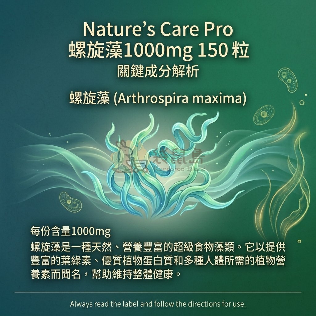 Nature's Care Pro 螺旋藻1000mg 採用 Arthrospira maxima(螺旋藻),每錠含量高達1000mg。螺旋藻蘊含均衡豐富的多種營養素,涵蓋葉綠素、蛋白質、胺基酸、礦物質,以及多種植物性營養素,是日常保健的天然來源選擇。