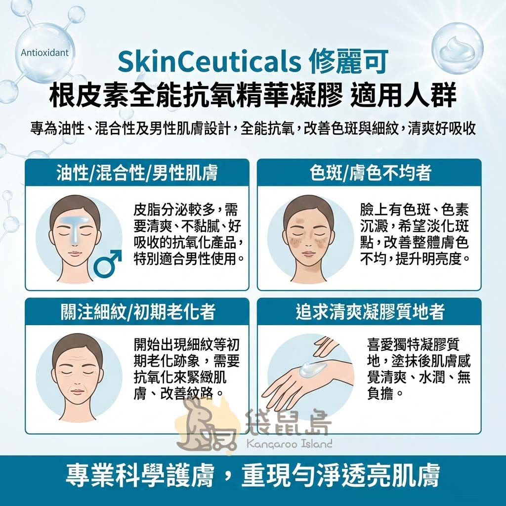- 🏃♂️ 油性/混合性及男性肌膚: 皮脂分泌較旺盛,尋求清爽、不黏膩、好吸收的抗氧化護理者。