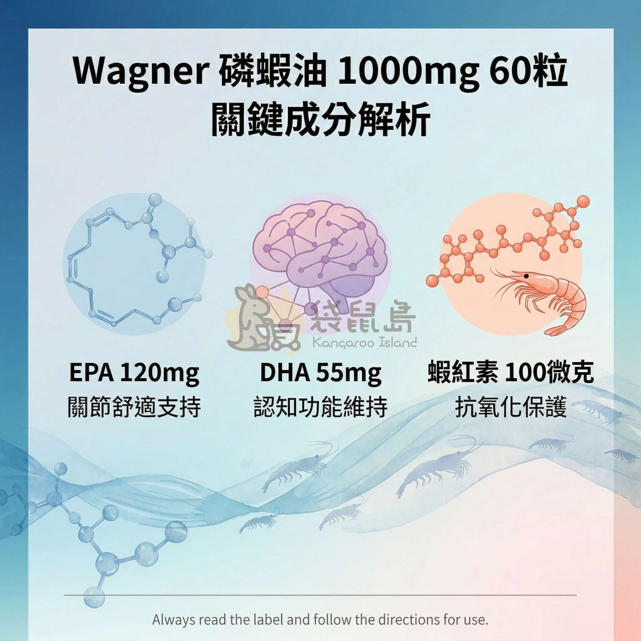 每粒膠囊含磷蝦油 1,000mg,其中包含 EPA(二十碳五烯酸)120mg 及 DHA(二十二碳六烯酸)55mg。EPA 與 DHA 屬人體無法自行合成的必需脂肪酸,需透過飲食或補充品攝取。