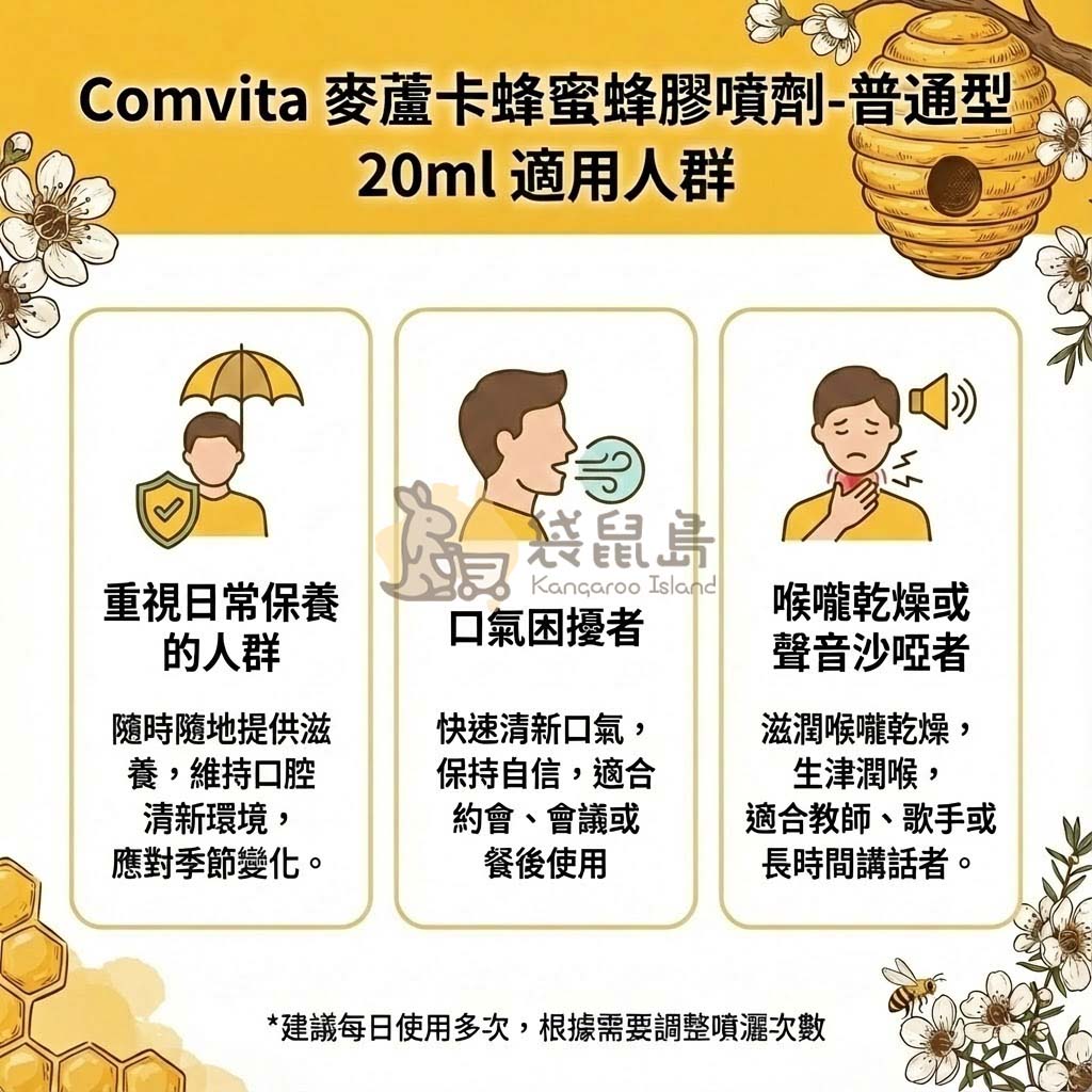 還在尋找能隨時隨地帶來自信口氣與滋潤感的秘密武器嗎?這款來自紐西蘭的 Comvita 康維他 麥蘆卡蜂蜜蜂膠噴劑 (普通型),結合了大自然的兩大黃金成分——珍貴的 UMF™ 10+ 麥蘆卡蜂蜜與蜂膠精華。輕輕一噴,彷彿置身純淨大自然,為您的口腔帶來清新滋潤感!由【袋鼠島 澳洲代購】為您空運直寄,確保您收到的是最新鮮的澳洲/紐西蘭原裝品質。🌿
