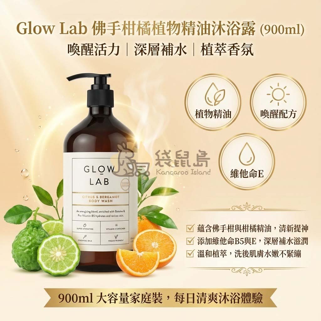 Glow Lab 佛手柑橘植物精油沐浴露 ✨ 喚醒活力與清爽保濕 (900ml 大容量)