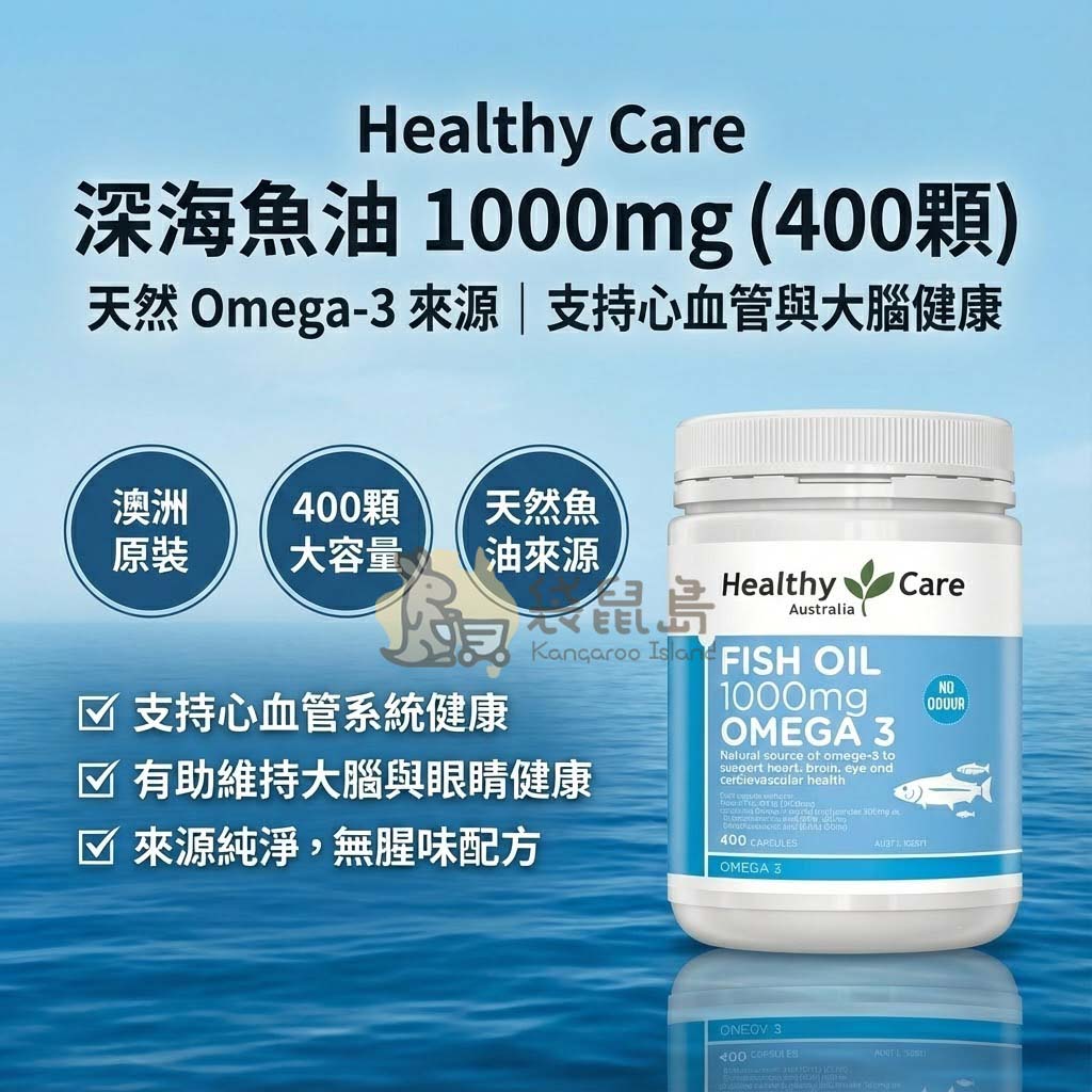 澳洲家庭必備的「國民魚油」來了!🐟 Healthy Care 深海魚油 1000mg 採用 400 粒超大容量包裝,是全家大小補充 Omega-3 的高 CP 值首選。🇦🇺 嚴選深海冷水魚類,經過去腥處理 (No Odour),只留營養不留異味。富含優質 EPA 與 DHA,是維持心臟、大腦與眼睛健康的基礎營養基石。