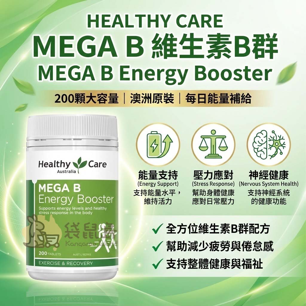 每天早晨醒來,您是否準備好迎接充滿挑戰的一天?🔋 Healthy Care 澳洲「Mega B 高單位B群」(Mega B Energy Booster) 是專為忙碌現代人設計的高性價比(CP值)補給。一瓶擁有 200 錠大容量,匯集了完整的維生素 B 群家族,幫助將食物轉化為能量,讓您在面對工作壓力與緊湊生活時,依然保持最佳狀態!🇦🇺✨