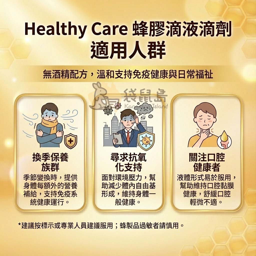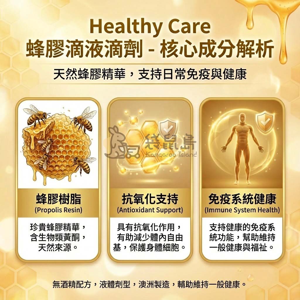 Healthy Care 蜂膠滴液 (無酒精版) 專為無法接受酒精辛辣感、或不擅長吞嚥膠囊的族群設計。每一滴都富含珍貴的蜂膠精華與生物類黃酮。不論是外用或內服,這款多功能的居家常備好物,都能為您和家人的健康加分!✨