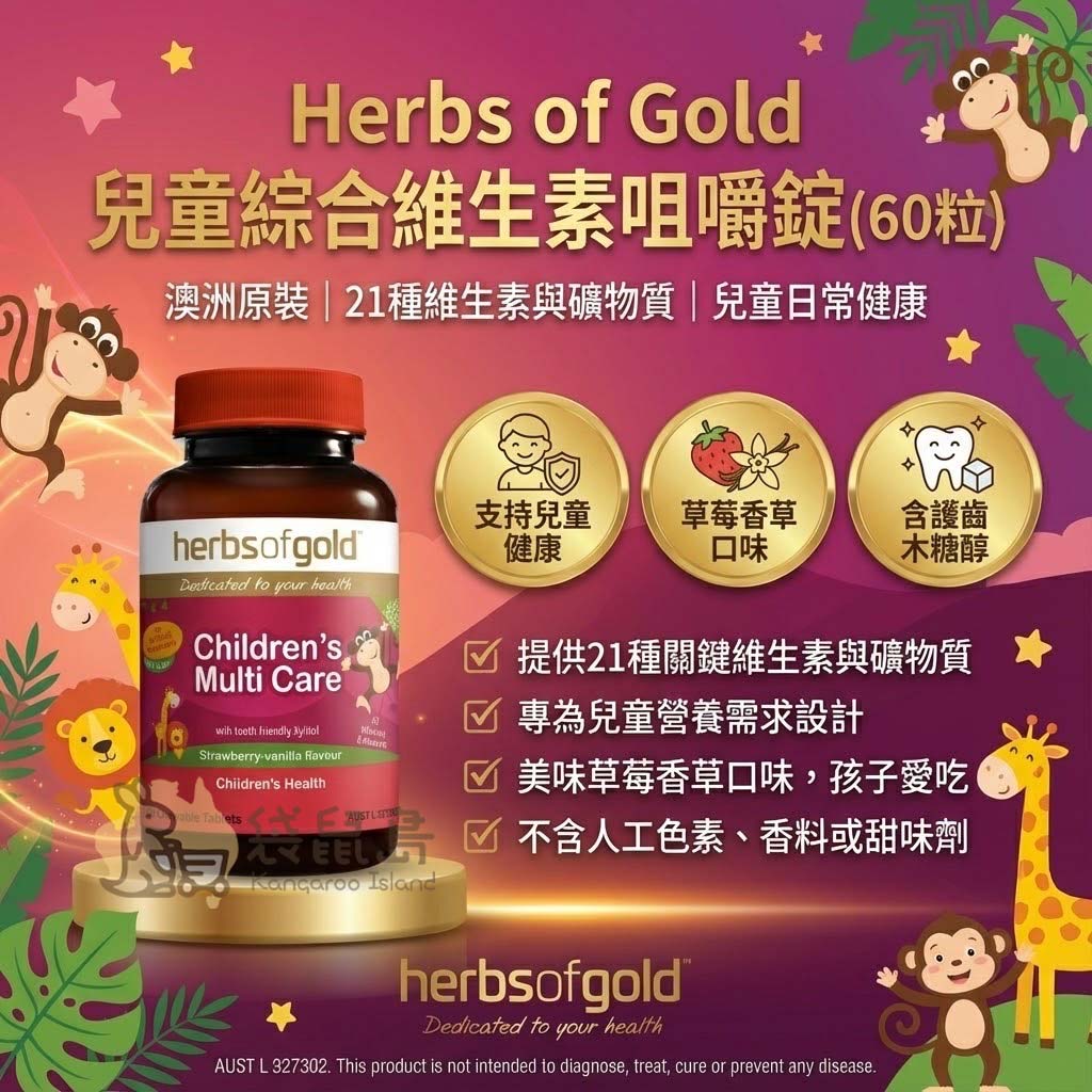 擔心孩子挑食、營養攝取不均衡嗎?讓澳洲媽媽的祕密武器來幫忙!🥗 Herbs of Gold 「兒童綜合維生素咀嚼錠」(Children's Multi Care) 專為成長中的孩子設計,將 21 種關鍵維生素與礦物質濃縮在美味的咀嚼錠中。這款來自澳洲的草莓香草味營養補給,就像孩子的健康成長後盾,填補日常飲食缺口,支持他們快樂成長每一天!🇦🇺✨