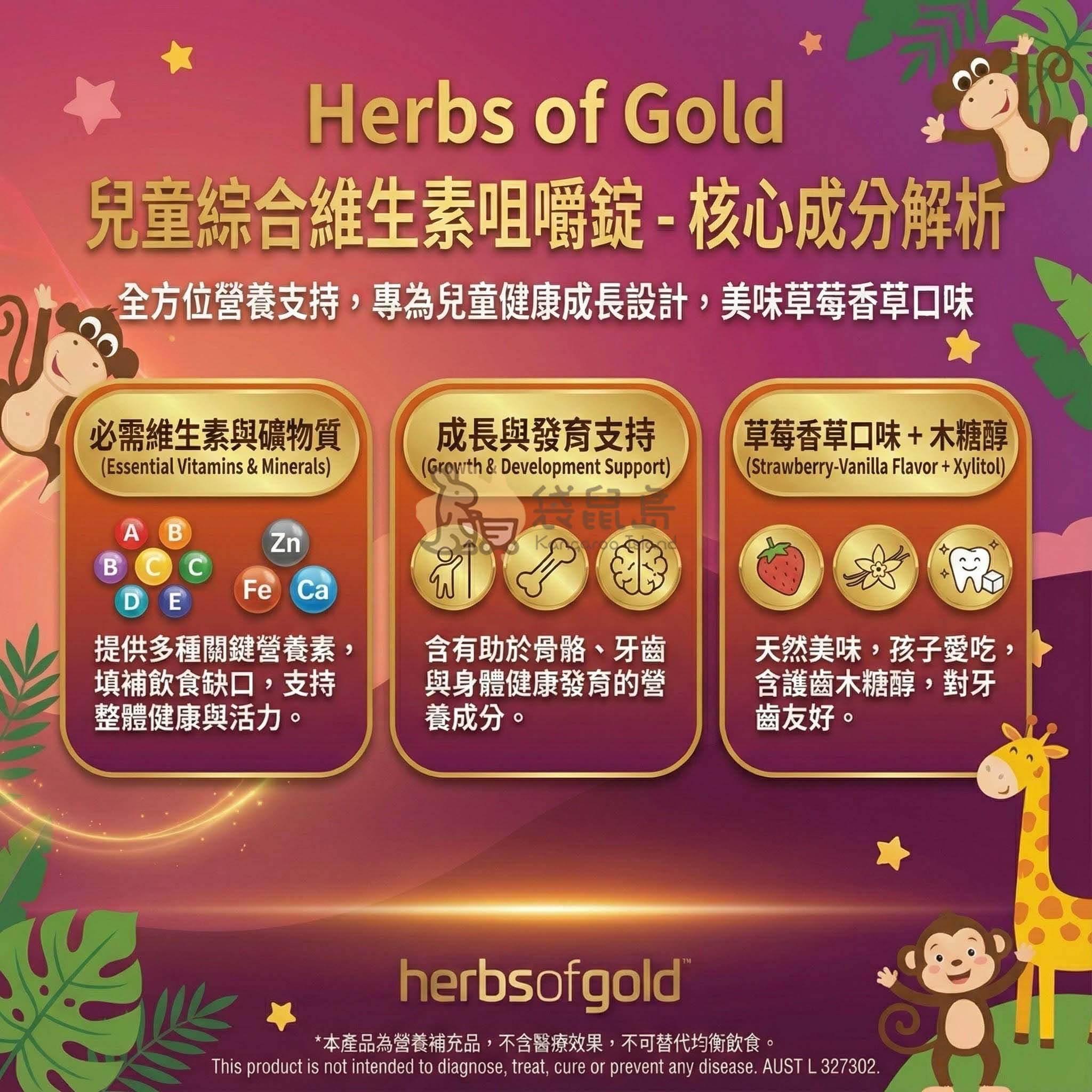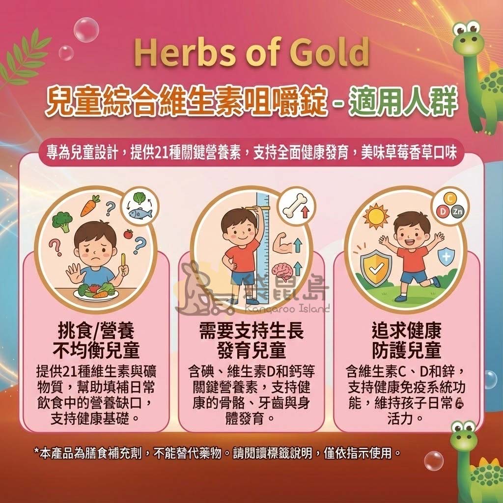 Herbs of Gold 兒童綜合維生素咀嚼錠 🍓 含21種營養素/B群/碘 (60粒)