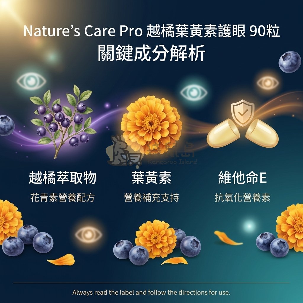 本品將越橘萃取、葉黃素、玉米黃素、β-胡蘿蔔素,搭配維他命 C、維他命 E、鋅、硒,組成多元護眼複方,全面支持日常眼部機能的維持,適合長時間用眼的現代生活所需。