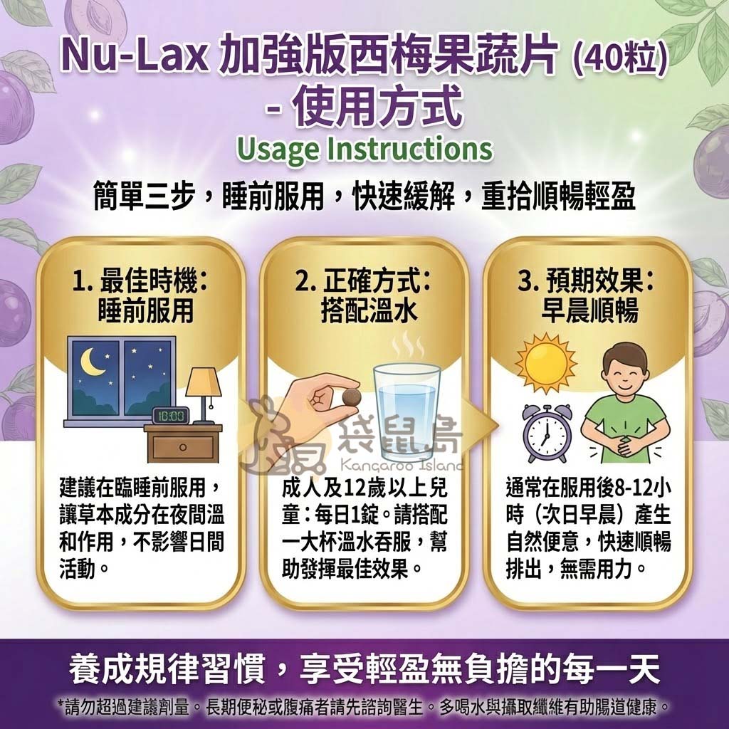 - 預期效果: 通常在服用後 8-12 小時 (次日早晨) 會產生自然且強烈的便意,快速順暢排出,無須過度用力。