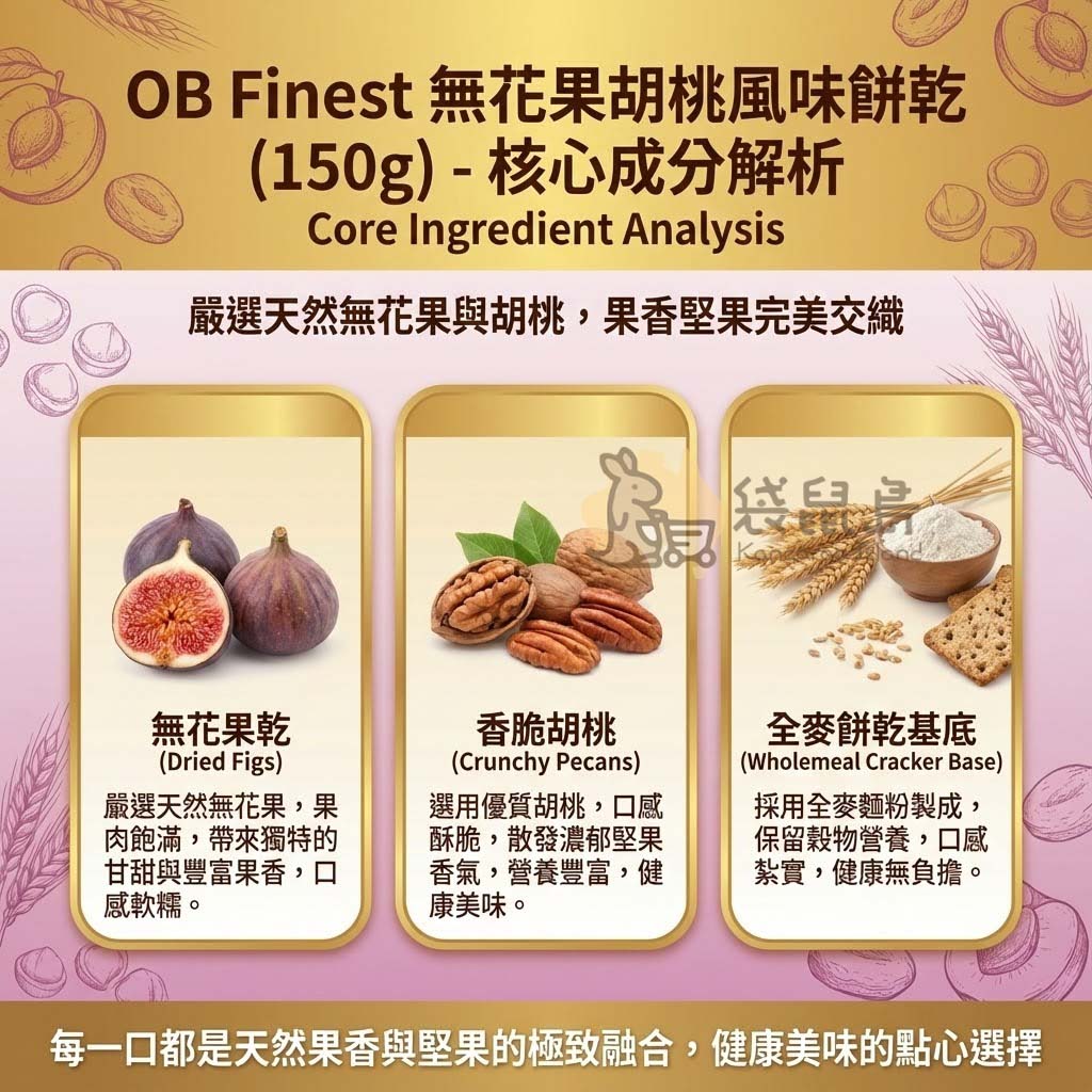 這款 OB Finest 無花果胡桃餅乾 是澳洲高端超市的熱銷明星。將地中海風情的 天然無花果 (Dried Figs) 與北美 香脆胡桃 (Crunchy Pecans) 完美揉合。果乾的軟糯香甜與堅果的酥脆口感在口中交織,層次豐富,風味優雅,是提升生活質感的必備點心。