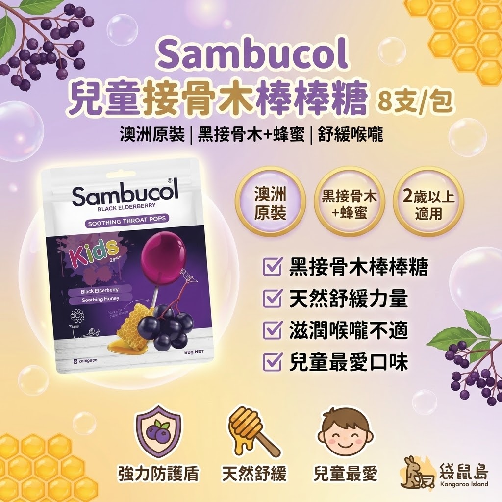 Sambucol 兒童黑接骨木舒緩棒棒糖 (8支入) | 含蜂蜜 舒緩喉嚨 | 澳洲原裝