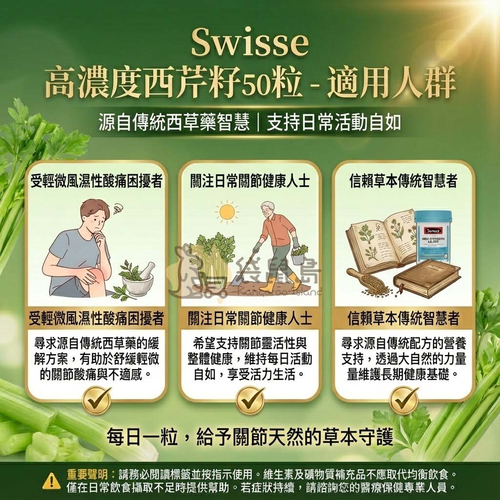 讓日常活動更輕盈自在,從源自大自然的傳統智慧開始!🌿 Swisse 高濃度西芹籽 (High Strength Celery) 採用傳統西方草本科學配方,每一粒均含有相當於 5,000 mg 的乾西芹籽活性精華。這款來自澳洲的優質補給,專為支持關節健康與傳統代謝應用設計,助您維持日常的舒適感,重拾靈活律動!🇦🇺✨