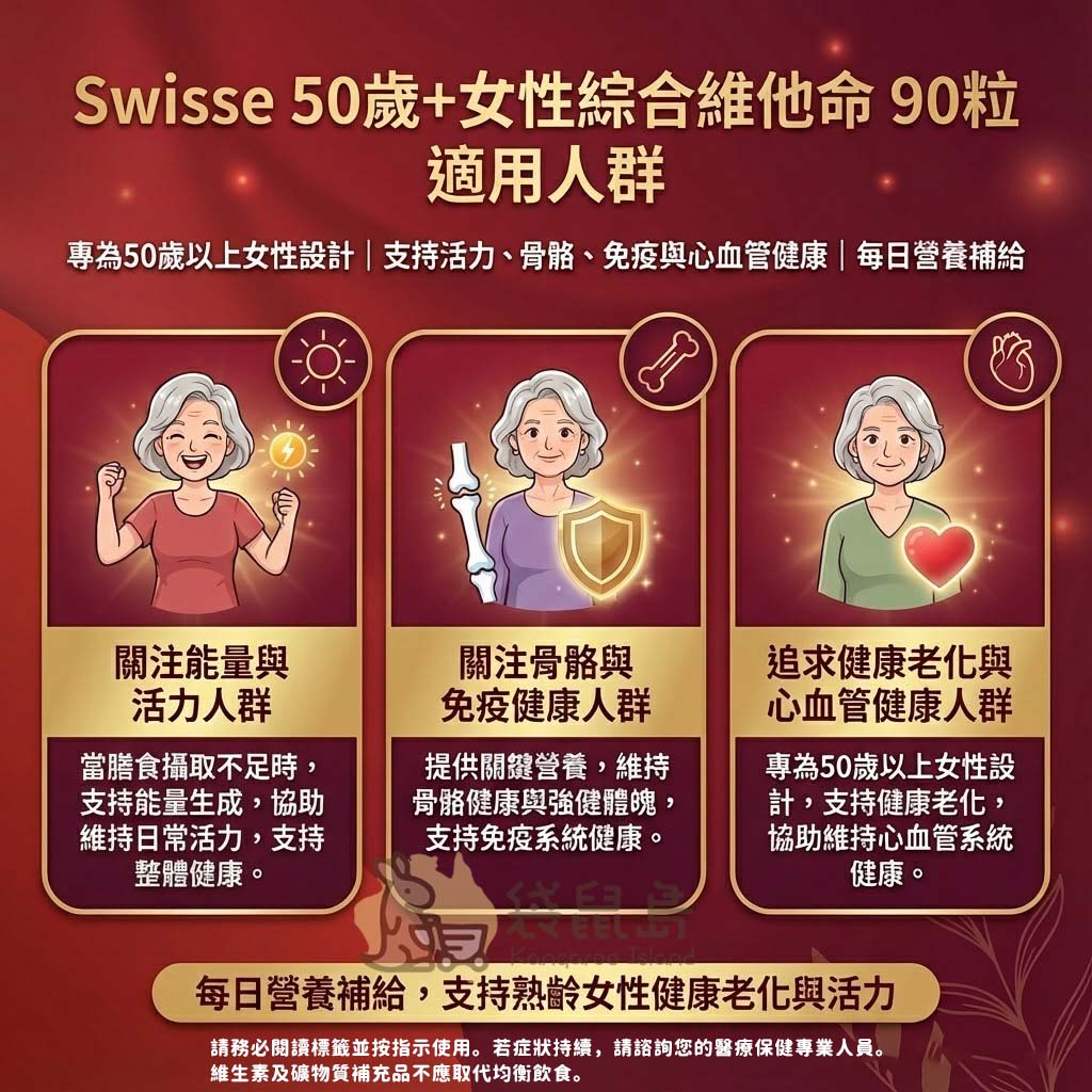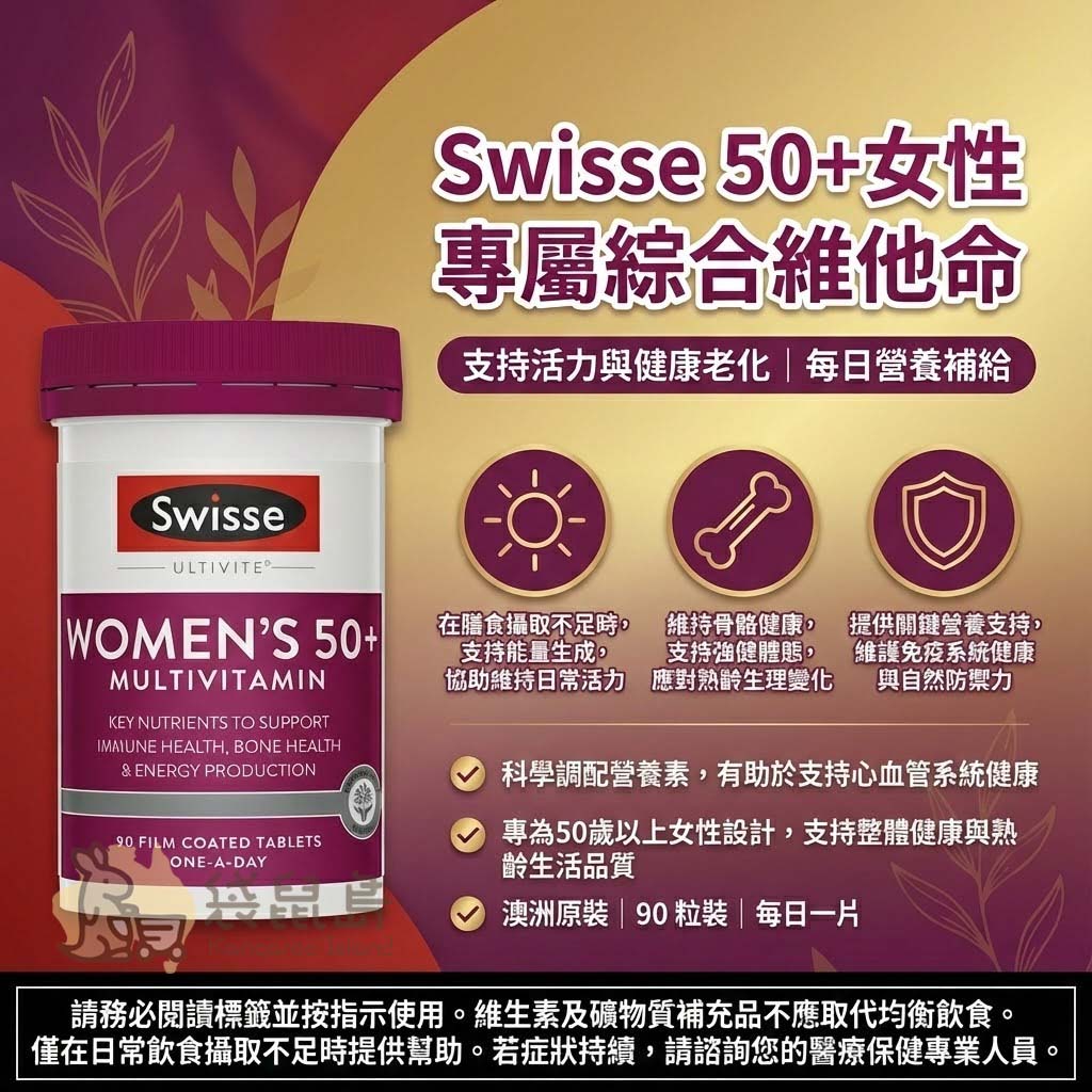 步入熟齡的優雅時光,您的健康值得更精準的細心支持!🌸 Swisse 「50歲+女性綜合維他命」(Women's 50+ Multivitamin) 採用專為熟齡女性研發的科學複方。這款來自澳洲的優質補給,針對中老年女性的生理需求,特別設計了支持能量代謝、骨骼健康與日常活力的營養配方。每日一錠,助您維持日常自信光采,從容享受精彩的熟齡生活!🇦🇺✨