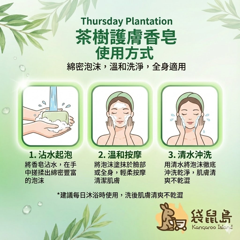 夏天背部容易長痘痘?臉部出油洗不乾淨?Thursday Plantation (星期四農莊) Tea Tree Skin Care Soap 是專為油性與混合性肌膚設計的潔膚皂。每塊香皂皆蘊含高品質的 100% 純茶樹精油,能深入毛孔清潔,帶走多餘油脂與髒污,讓肌膚重獲清爽呼吸感。