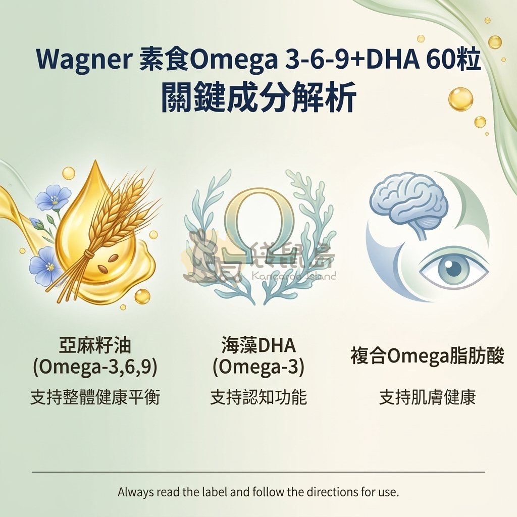 Wagner 素食Omega 3-6-9+DHA 以亞麻籽油(Flaxseed oil)為主要來源,每粒膠囊含有: